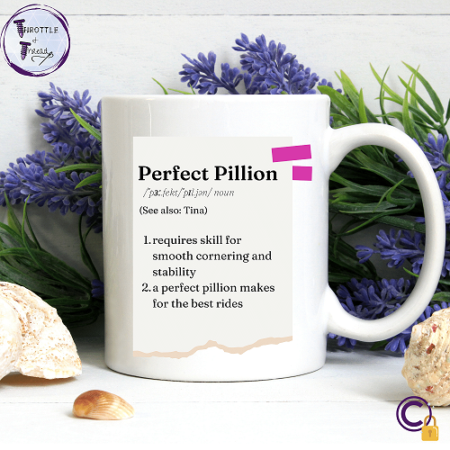 Personalised mug. Novelty biker gift. Gift for bikers. ‘Perfect Pillion’ Gift for Biker chick/ female rider/ lady rider/ classic bikers/ pillion/ motocross/ green lane/ classic biker.